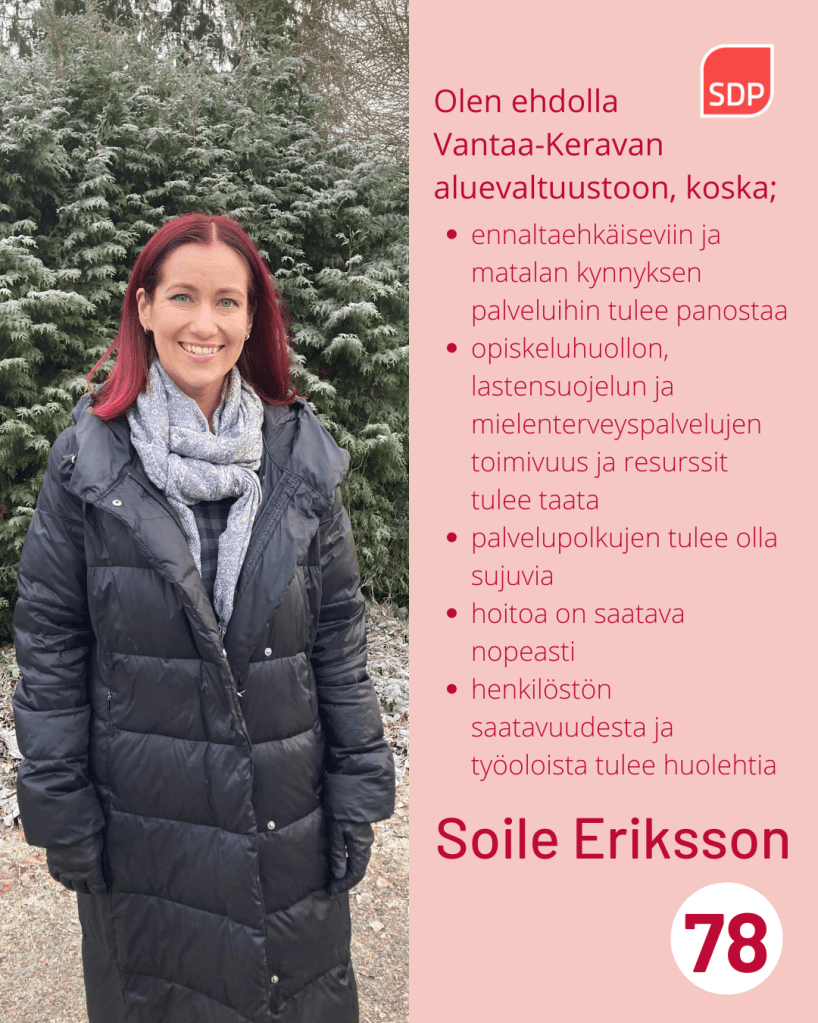 Jos joskus vielä olen ehdolla vaaleissa, on tästä ensimmäisestä kokemuksesta monta käytännön vinkkiä ja ajatusta opiksi vietäväksi seuraavaan kampanjaan. Onneksi sitä ei kuitenkaan tarvitse vielä pitkään aikaan miettiä. Ensin on aika toipua tästä vaalihumusta ja ryhtyä töihin toimivien ja ennaltaehkäisevien palveluiden puolesta meidän kaikkien vantaalaisten ja keravalaisten yhteiseksi hyväksi.