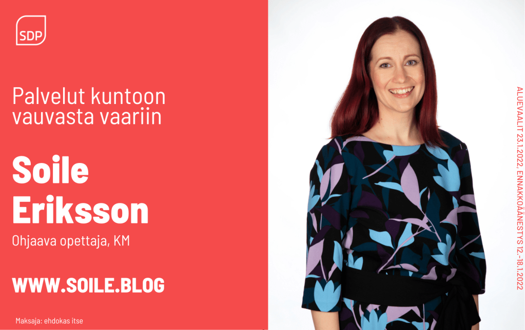 Tätä kirjoittaessani on kulunut noin viikko aluevaaleista. Haluan sydämellisesti kiittää kaikkia minua äänestäneitä siitä suuresta luottamuksesta, jonka minulle olette osoittaneet. Lisäksi haluan kiittää kaikkia kampanjaani tavalla tai toisella osallistuneita. Olen saanut apua mm. esitteiden jakamiseen, sosiaalisen median julkaisuiden tekemiseen ja levittämiseen, kotisivujen rakentamiseen, podcastin tekemiseen jne. Lisäksi jokainen saamani tsemppausviesti antoi uutta potkua kampanjointiin. Myös tuloksen selviämisen jälkeen saamani viestit ovat ilahduttaneet minua suuresti. Tärkeä tuki on tietenkin ollut oma puoliso, joka on jaksanut auttaa ja kannustaa, vaikka hänellä useat illat ja viikonloput ovat menneet huolehtiessa yksin kahdesta pienestä ja aktiivisesta lapsesta.