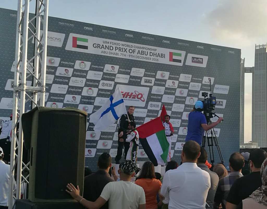 Merkityksellisiä hetkiä olivat myös ne tilanteet, joissa Suomi oli mainittu paikallislehdissä tai muutoin esillä. Yksi hauskimmista uutisista oli se, kun Tasavallan presidentti Sauli Niinistö oli bongattu rullaluistelemassa Abu Dhabin formularadalla (https://www.thenationalnews.com/…/president-of-finland-adds…). Yllättävä tunnelmallinen hetki puolestaan sattui eräänä tylsänä lauantaipäivänä juuri itsenäisyyspäivän jälkeen, kun päädyin yksikseni F1-veneiden kisakatsomoon tietämättä, että mukana oli myös suomalaisia. Fiilis oli huikea, kun Sami Seliö päätyi palkintopallille ja Suomen lippu liehui silmieni edessä.